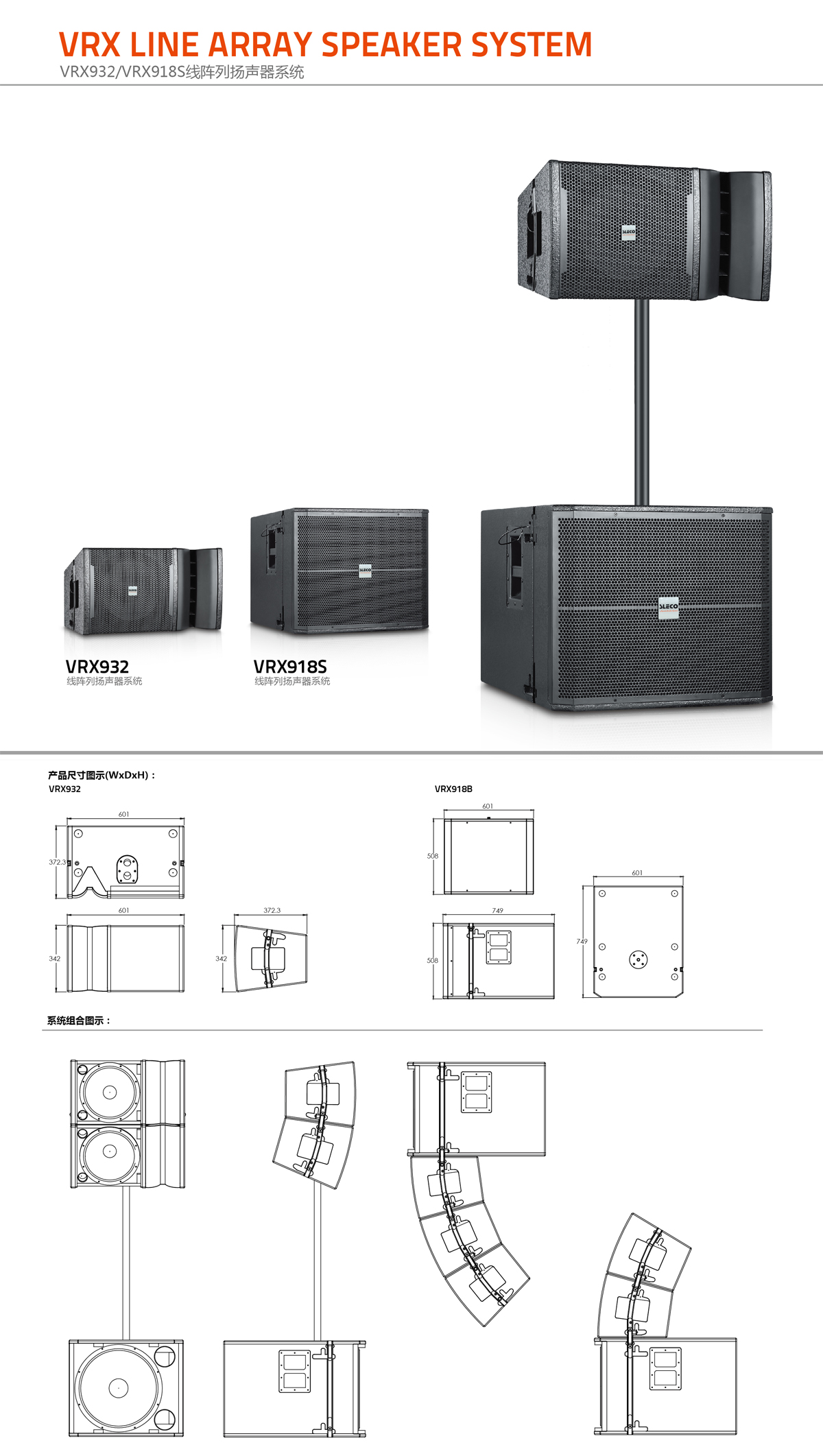 VRX系列是专为剧院、体育场馆、户外演出等场所而精心设计的线性阵列扬声器系统。VRX932由一个12"的低频驱动单元以及三个38mm钕铁硼高频驱动单元组成,高频覆盖角度为100°×15°,而VRX918S是由一个18"的超低频驱动单元组成。VRX使用了高密度夹板制作,箱体表面喷涂黑色耐磨砂点涂料,抗老化强度方面能力强,能长期经受日晒雨淋,而安装在户内更是能防止潮湿等恶劣的环境。